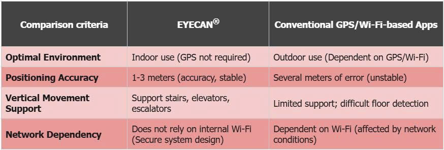 EYECAN vs. Conventional GPS/Wi-Fi-Based Navigation Apps
